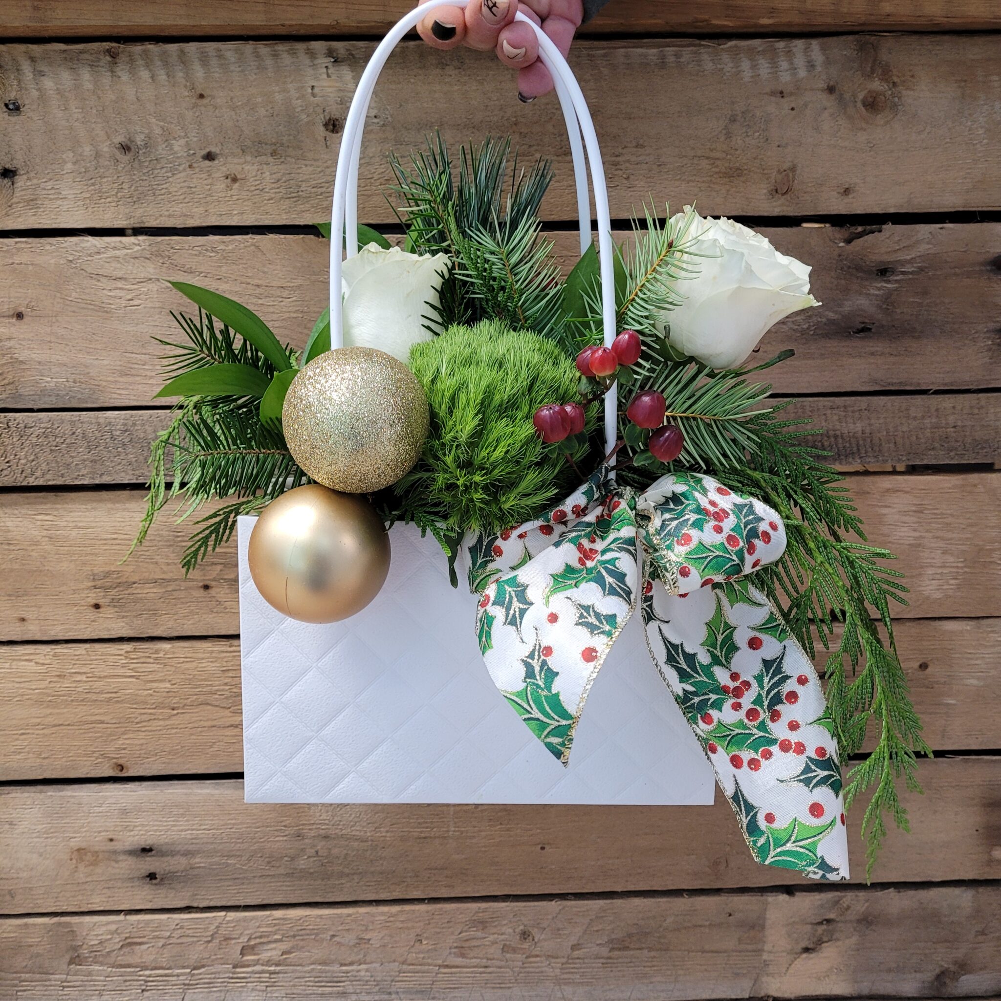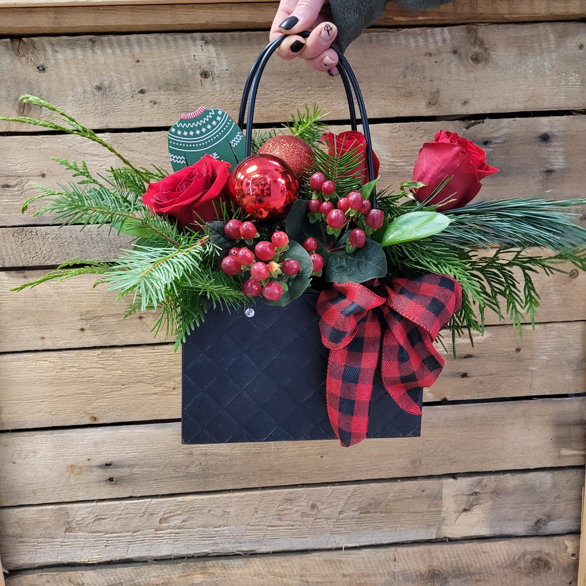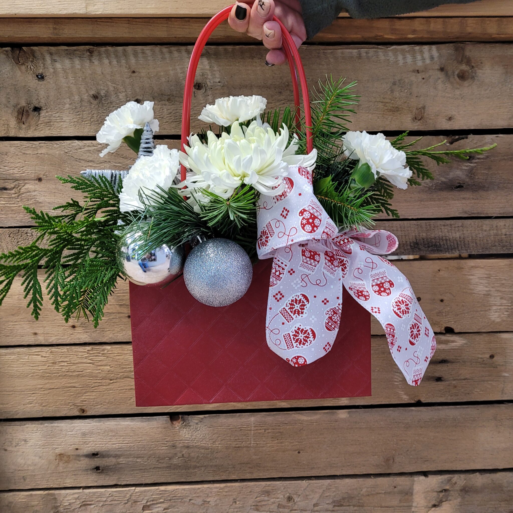 Un arrangement de fleurs et de feuillages des fêtes dans un superbe sac (mélange de cèdre, pin, et épinette), joliment décoré pour la saison des fêtes. Pour la maison, en cadeaux d’hôtesse ou pour apporter dans la famille. Cette année soyez original!!