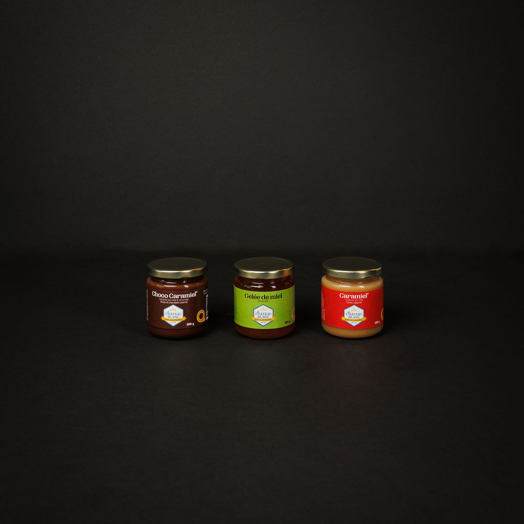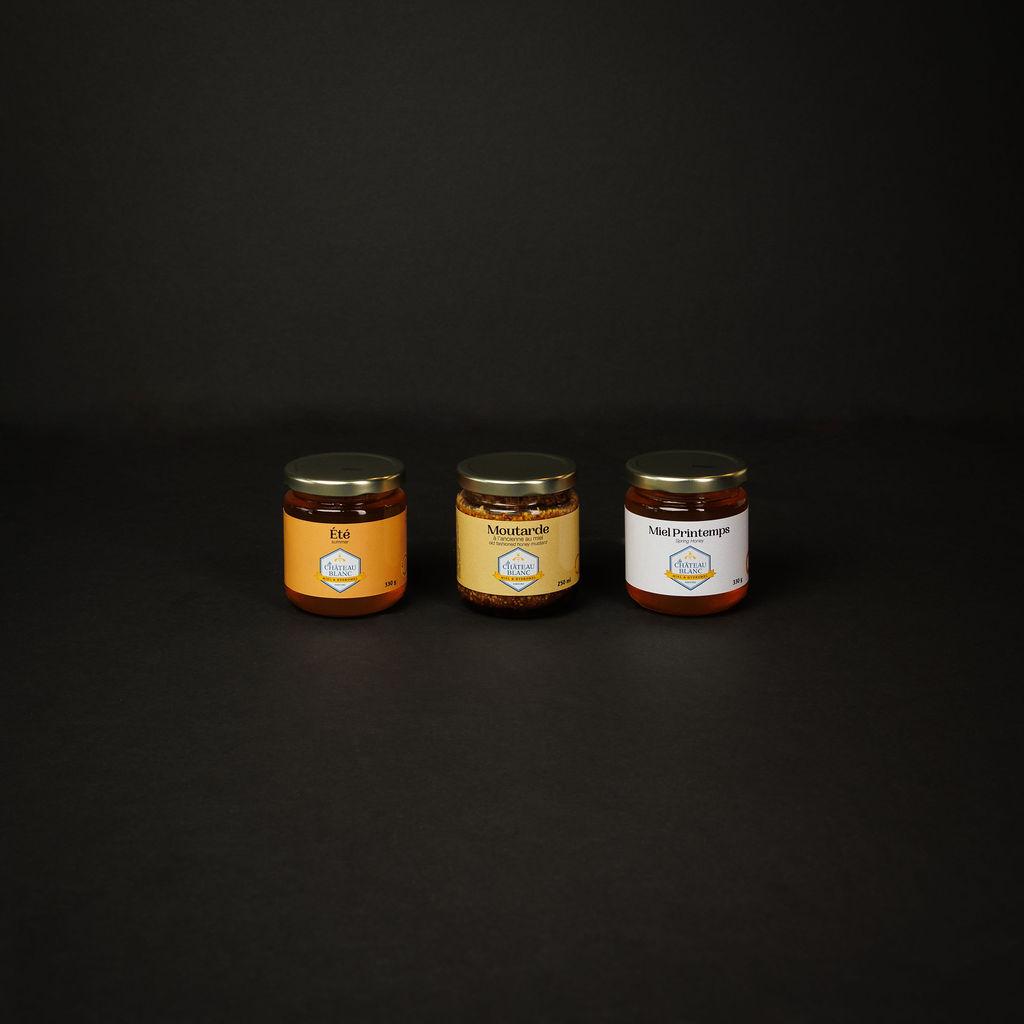 Un ensemble cadeau avec les produits de Château Blanc-miellerie.